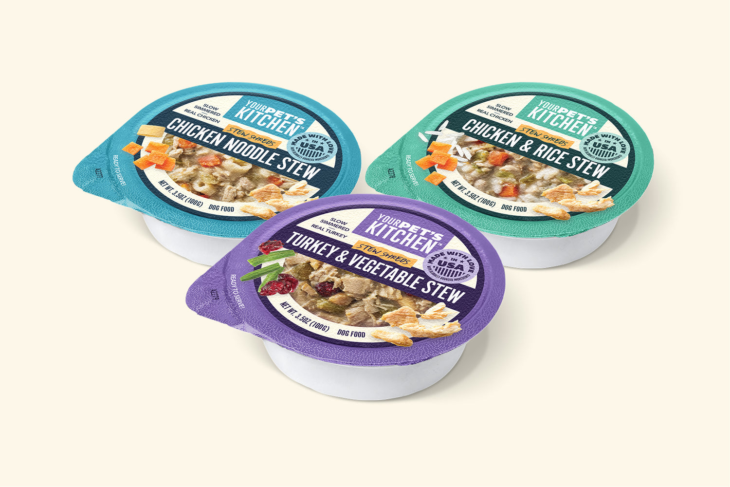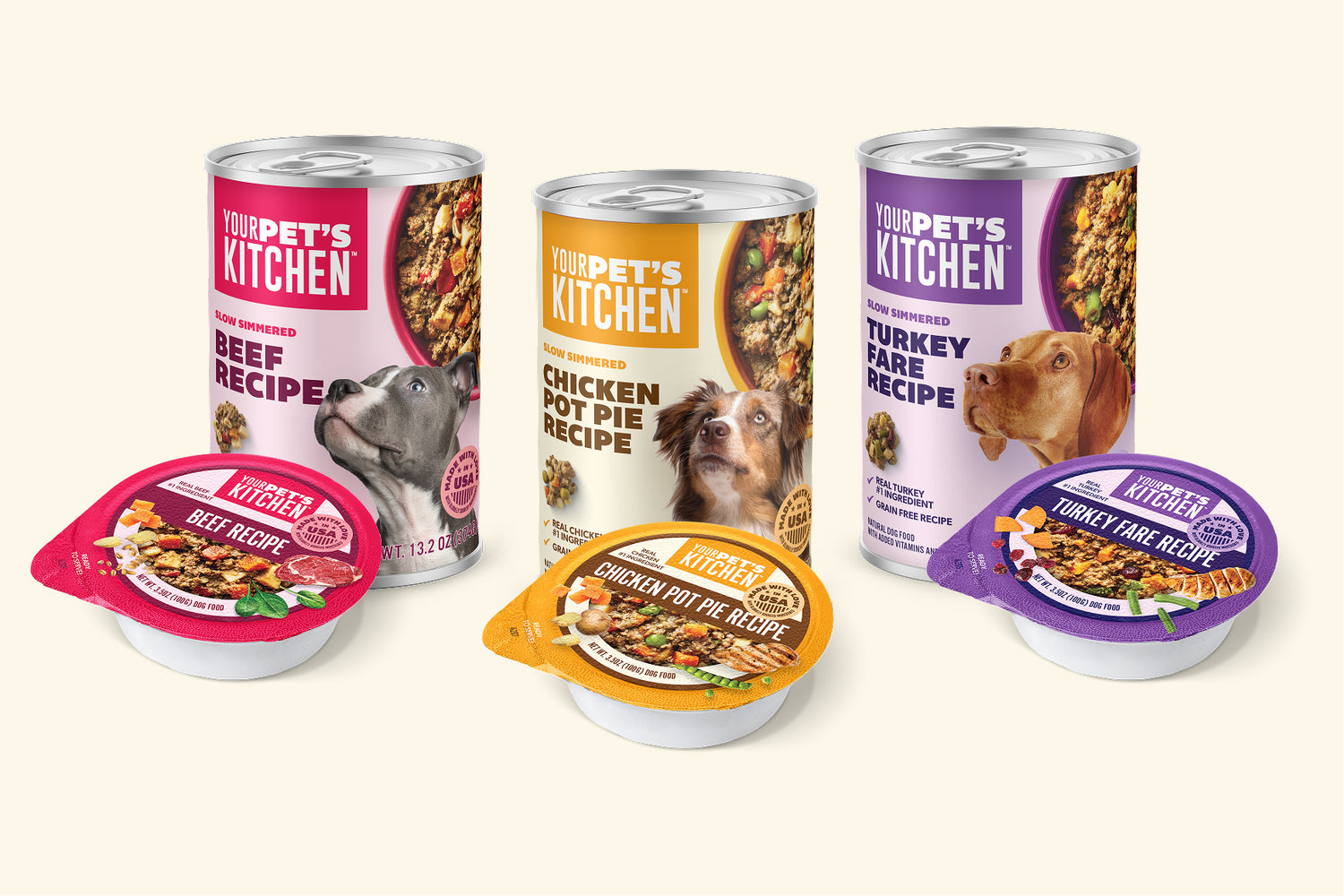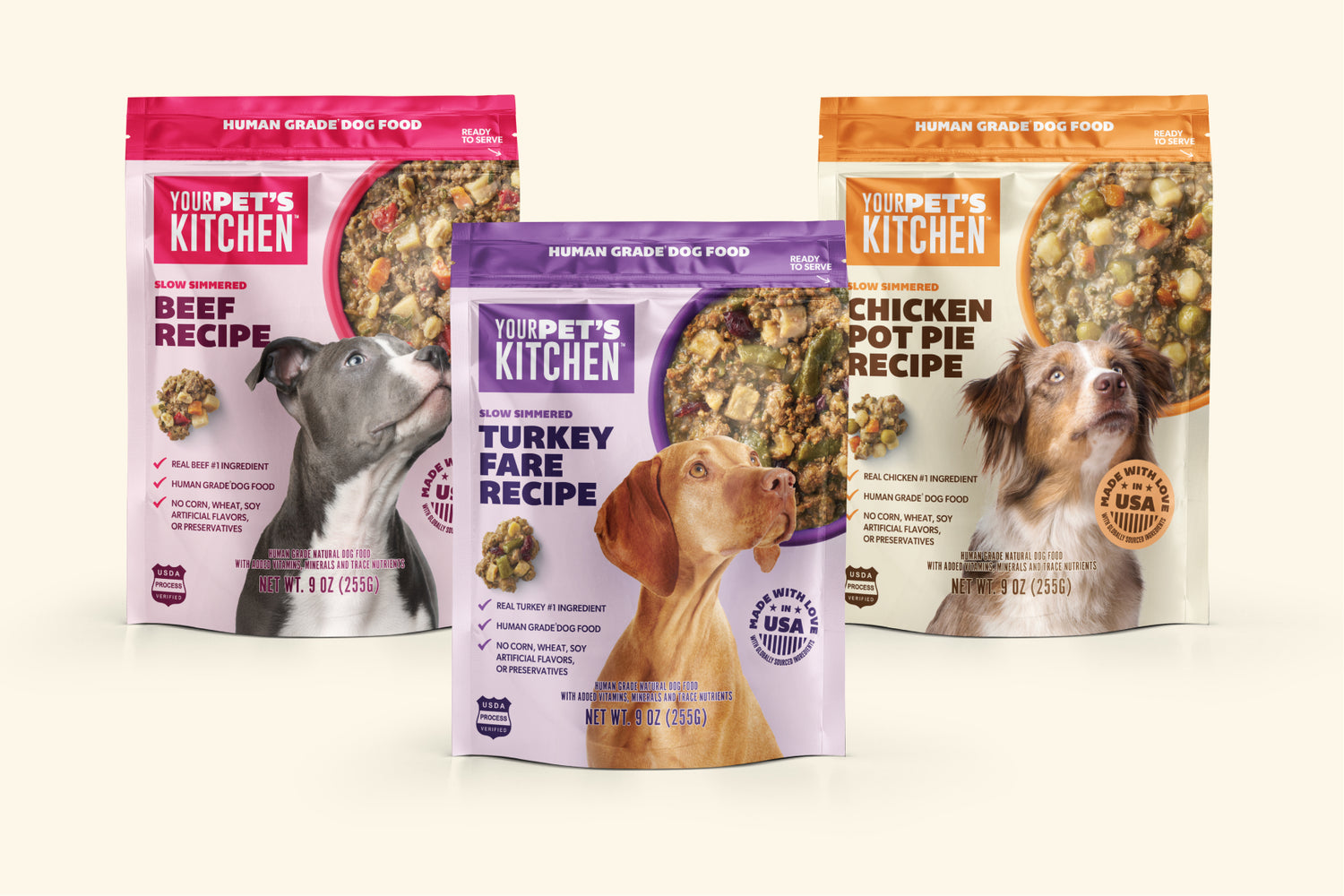 Real, human grade ingredients in convenient, easy to serve pouches. Your Pet’s Kitchen pouches deliver homestyle recipes made with beef, chicken, or turkey, perfect for picky eaters, quick meals, and adding wholesome variety to your dog’s routine.