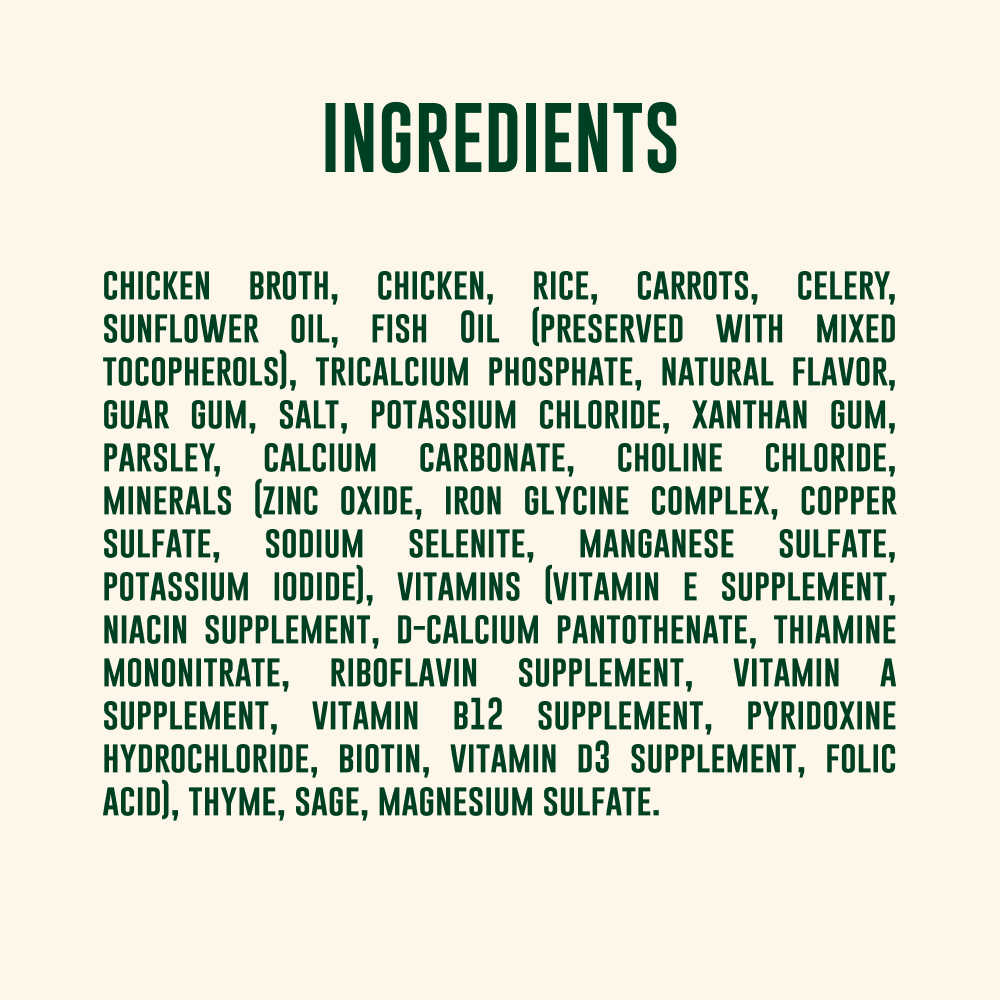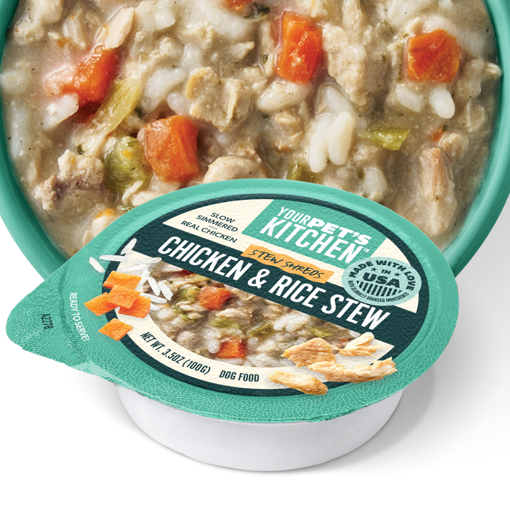 Your Pet’s Kitchen™ Chicken & Rice Stew Shreds Cup delivers cozy, stew-inspired comfort in a convenient single-serve format. Made with real chicken as the #1 ingredient and served in a savory broth, this stew-inspired recipe delivers visible shreds, recognizable veggies, hearty grains, rich aroma, and satisfying texture. Made with love in the USA with carefully sourced ingredients, it can be served as a complete meal or used as a broth-forward topper to turn everyday feeding into a warm, comforting moment.
