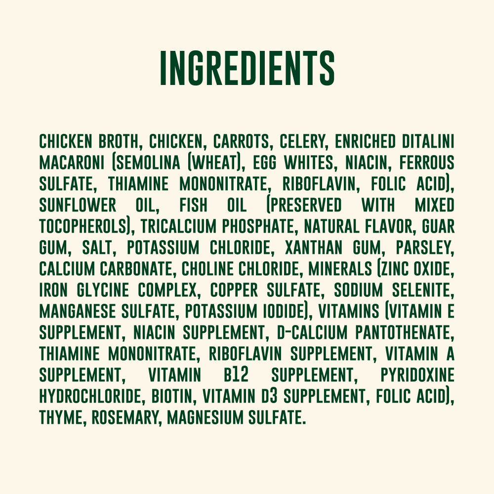 Your Pet’s Kitchen™ Chicken Noodle Stew Shreds Cup delivers cozy, stew-inspired comfort in a convenient single-serve format. Made with real chicken as the #1 ingredient and served in a savory broth, this stew-inspired recipe delivers visible shreds, recognizable veggies, rich aroma, and satisfying texture. Made with love in the USA with carefully sourced ingredients, it can be served as a complete small meal or used as a broth-forward topper to turn everyday feeding into a warm, comforting moment.