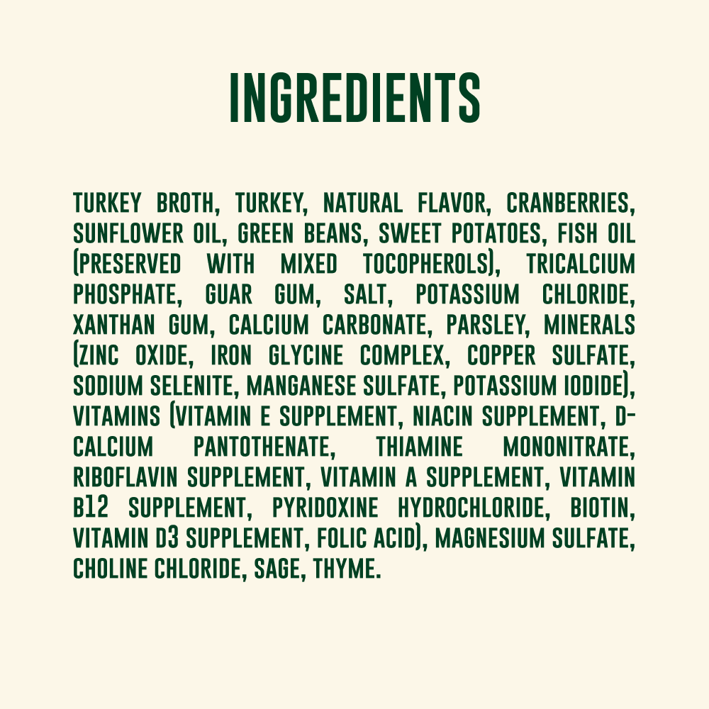 - WHOLE MUSCLE SHREDS & RECOGNIZABLE INGREDIENTS: Shredded turkey paired with visible chunks of sweet potatoes, cranberries, and green beans in a silky-smooth broth means quality you can see in every bowl.